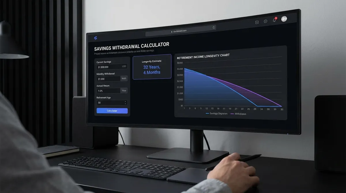 The savings withdrawal calculation determines how long your retirement savings will last by modeling the monthly interplay between your starting balance, investment returns, withdrawal amounts, and additional income sources. Unlike simple linear projections, proper withdrawal calculations account for compound interest, inflation adjustments, and varying cash flows to provide realistic longevity estimates.